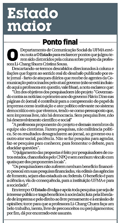 No dia seguinte, a coluna Estado Maior surpreendeu ao atacar a pesquisa, coordenada pela professora Li-Chang Shuen Cristina Silva Sousa em parceria com o diretor da Fundação Maurício Grabois, professor Fábio Palácio de Azevedo, e a professora Josefa Bentivi Andrade. A equipe de doutores responsável pela pesquisa compõe o corpo docente do Departamento de Comunicação da Universidade Federal do Maranhão.